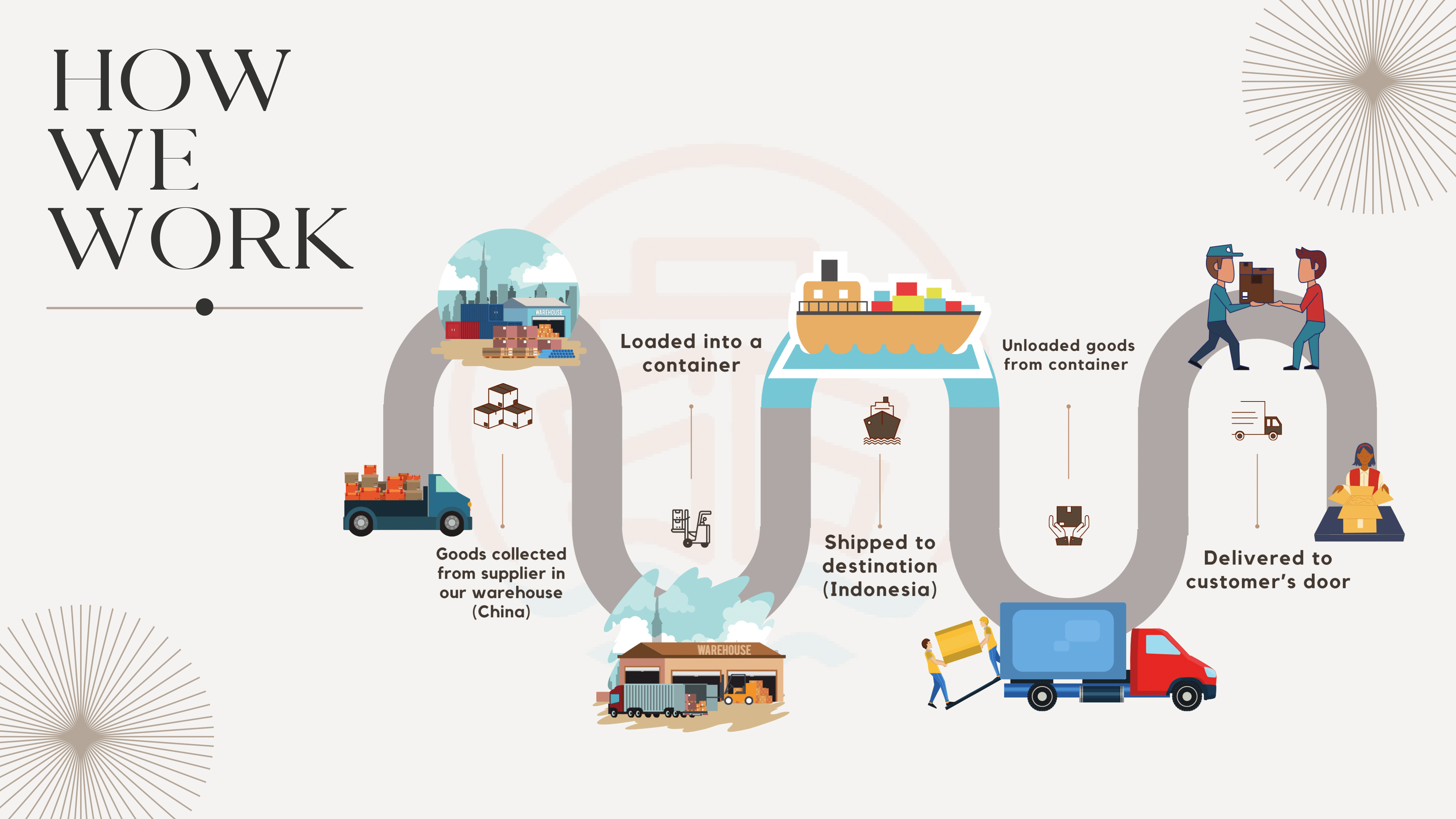 The clients communicate with the supplier to ship the goods to our warehouse in China. After that, we stuff the goods into the container and ship them to Batam, Indonesia.